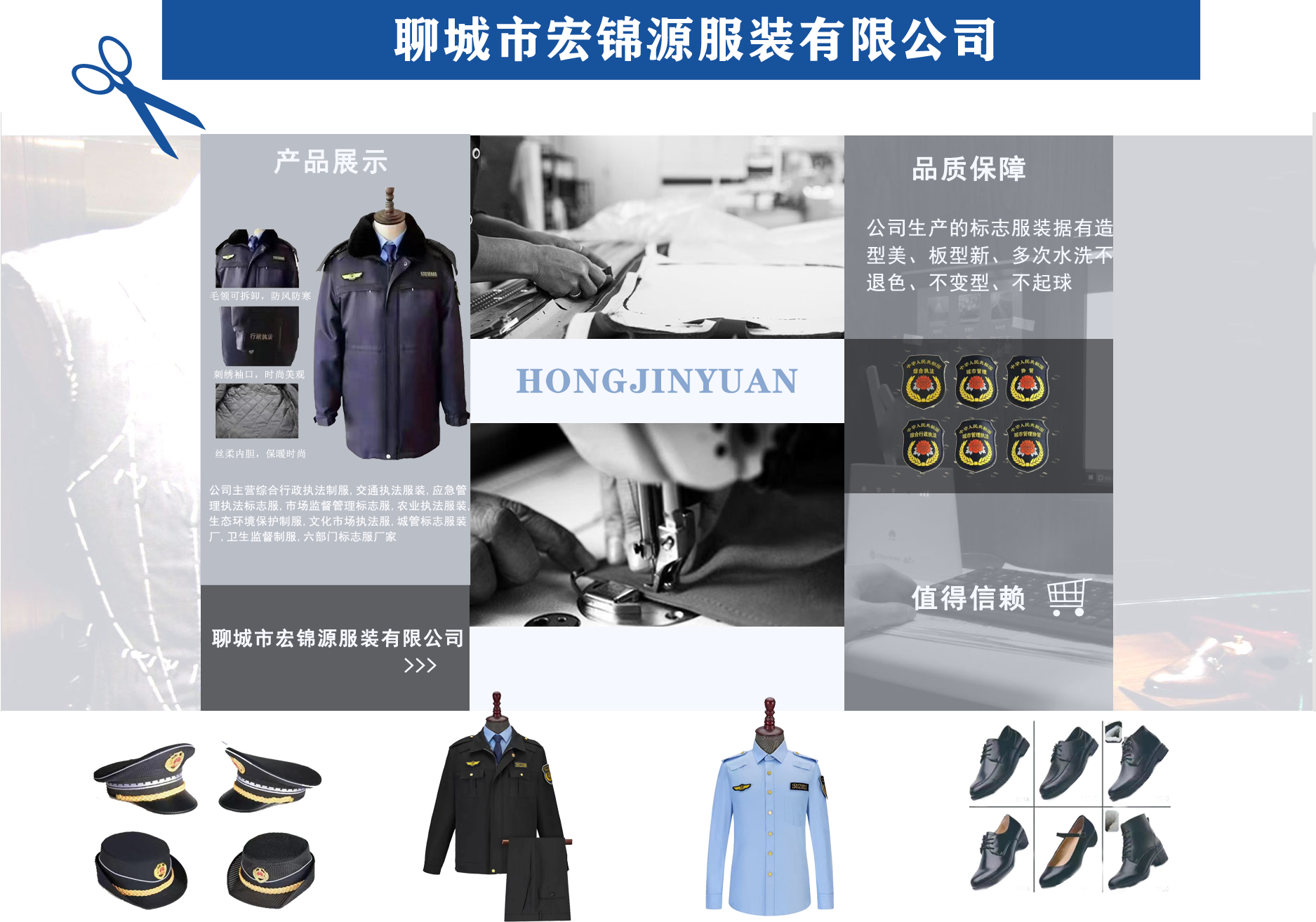 聊城市宏錦源服裝有限公司位于江北水城—山東聊城,地理位置優越,交通便利。公司主營綜合行政執法制服,交通執法服裝,應急管理執法標志服,市場監督管理標志服,農業執法服裝,生態環境保護制服,文化市場執法服,城管標志服裝廠,衛生監督制服,六部門標志服廠家等,值得信賴! 公司生產的標志服裝據有造型美、板型新、多次水洗不退色、不變型、不起泡。 “認真辦事,踏實做人”是宏錦源的企業精神,我們的宗旨是:“用服務與真誠來換取你的信任與支持,互惠互利,共創雙贏!”我公司愿與國內外各界同仁志士竭誠合作,共創未來企業目標:在已選定的服飾領域中,成為行業的卓越者。 經營理念:追求產品卓越,為用戶提供完美、高效的服務。...
